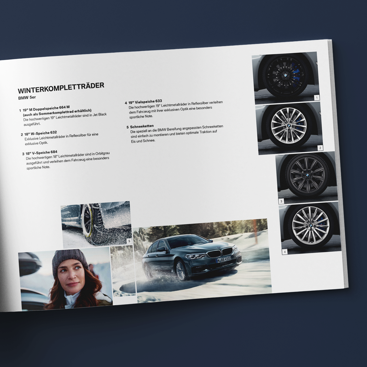 Das hochwertige BMW Zubehör wird in den Verkaufsmedien strukturiert in Szene gesetzt und unterstreicht den Premiumanspruch der Marke. Konzept und Layout berücksichtigen die Sprachadaption im internationalen Markt.